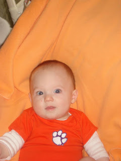 Mimi came and spent the night with us on Saturday night. We were supposed to go to Hickory for the night but after we got the car all loaded with the million things you have to take with you for just one night we decided it might be easier if she came here and of course that was fine with her. She had a great visit. Mimi bought Crawford a Jummping swing and he loved it. We made Crawford an outfit, she is teaching me to sew. Let's just say, it's harder than I thought but I am not going to give up. Mom could not believe how much Crawford had grown in just the short time since she had seen him. Here are a few pictures from last week of Crawford at 5 1/2 months.